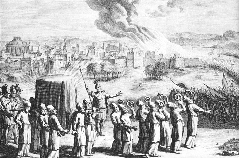 The covered ark with golden staves carried by the priests, and seven priests with rams’ horns, at the siege of Jericho, in an eighteenth-century artist’s depiction.